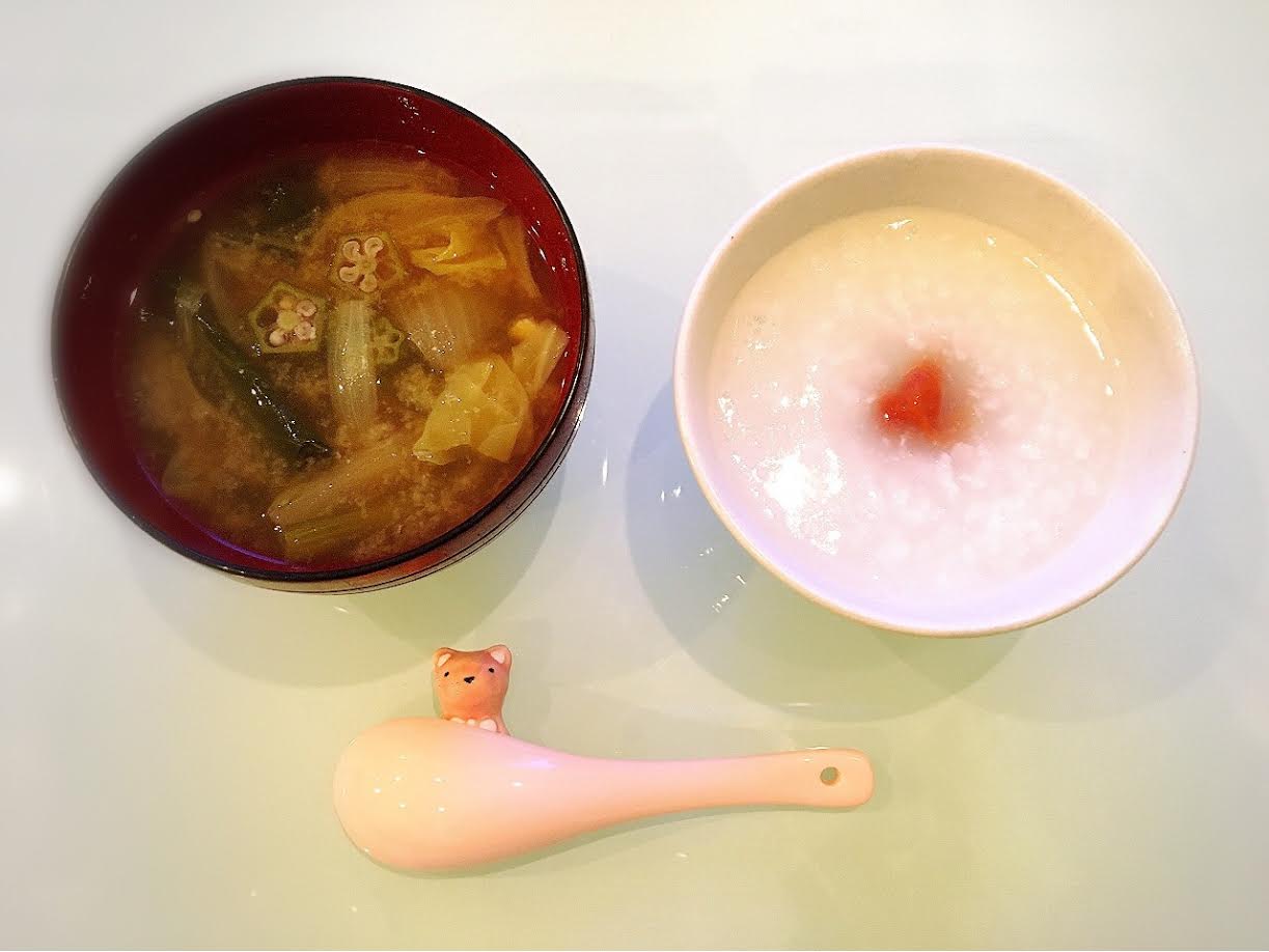 そして夜は・・・またもやおかゆ&梅干し(塩漬け)&お味噌汁です。