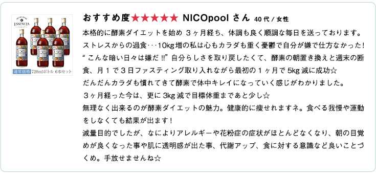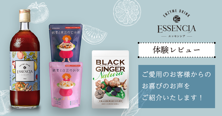 1日断食は何度か経験があるのですがその間、口にしていたのは水のみでした。とてもつらく必死(笑)体重は減ってもどことなくやつれていました。これでは痩せても綺麗にはならない!と思い、ネットで色々調べ、エッセンシア酵素に出会いました。これはいい!すごくいいです!あの辛さはなんだったの?というくらい朝がスッキリ。やつれもなくなり、健康的に痩せることができました。髪もツヤがでたような・・・。