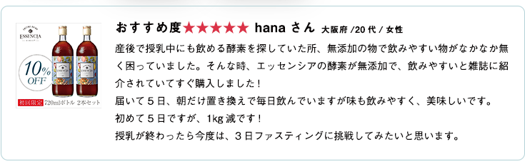 産後太りをリセットしたいと思い、エッセンシアでのファスティングにチャレンジしました。 元々食べることが大好きな為、不安でしたがファスティング中そこまで空腹に悩まず、 おいしく続けることができました!! 飲んですぐ便秘が改善し、体がとても軽くなりました。また購入したいと思います。 おかげ様で産前の体重に戻りました!