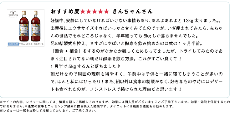 ※サイトの内容,レビューに関しては、慎重を期して掲載しておりますが、効果には個人差がございますことご了承下さいませ。効果・効能を保証するものではありません。 ※通常の食事をエッセンシア酵素に置き換えた結果です。ダイエットには適度な運動もお勧めします。