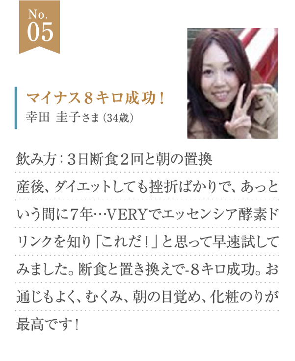 現在は酵素ファスティングマイスター1級の資格を持つママ。産後太りをはじめ、あらゆるダイエット成功までのサポートを重視しており、1万人以上のカウンセリング実績を持つ。